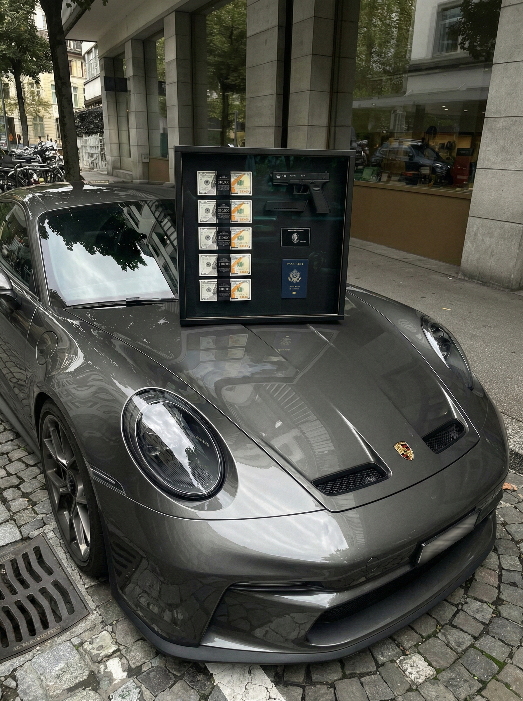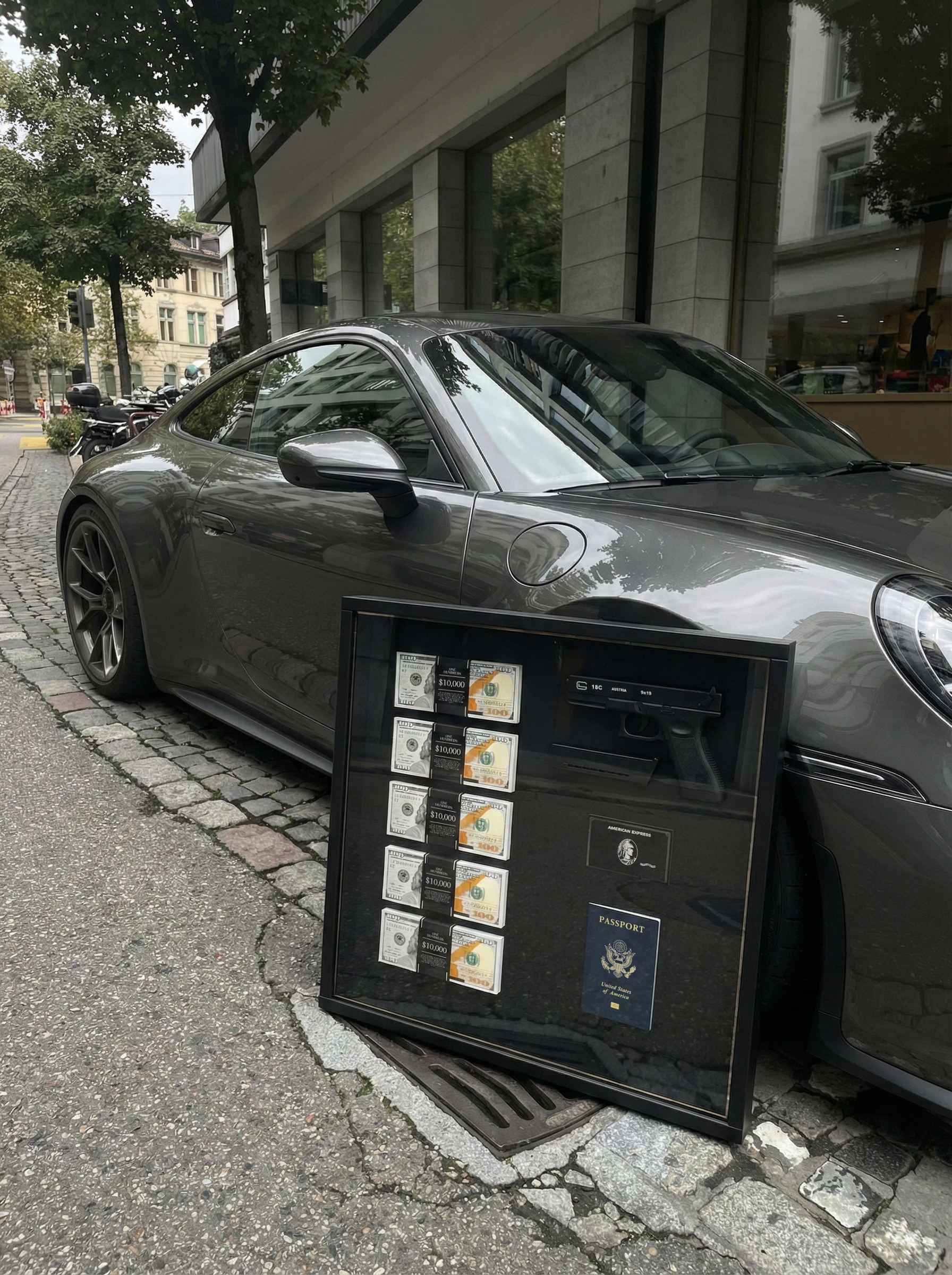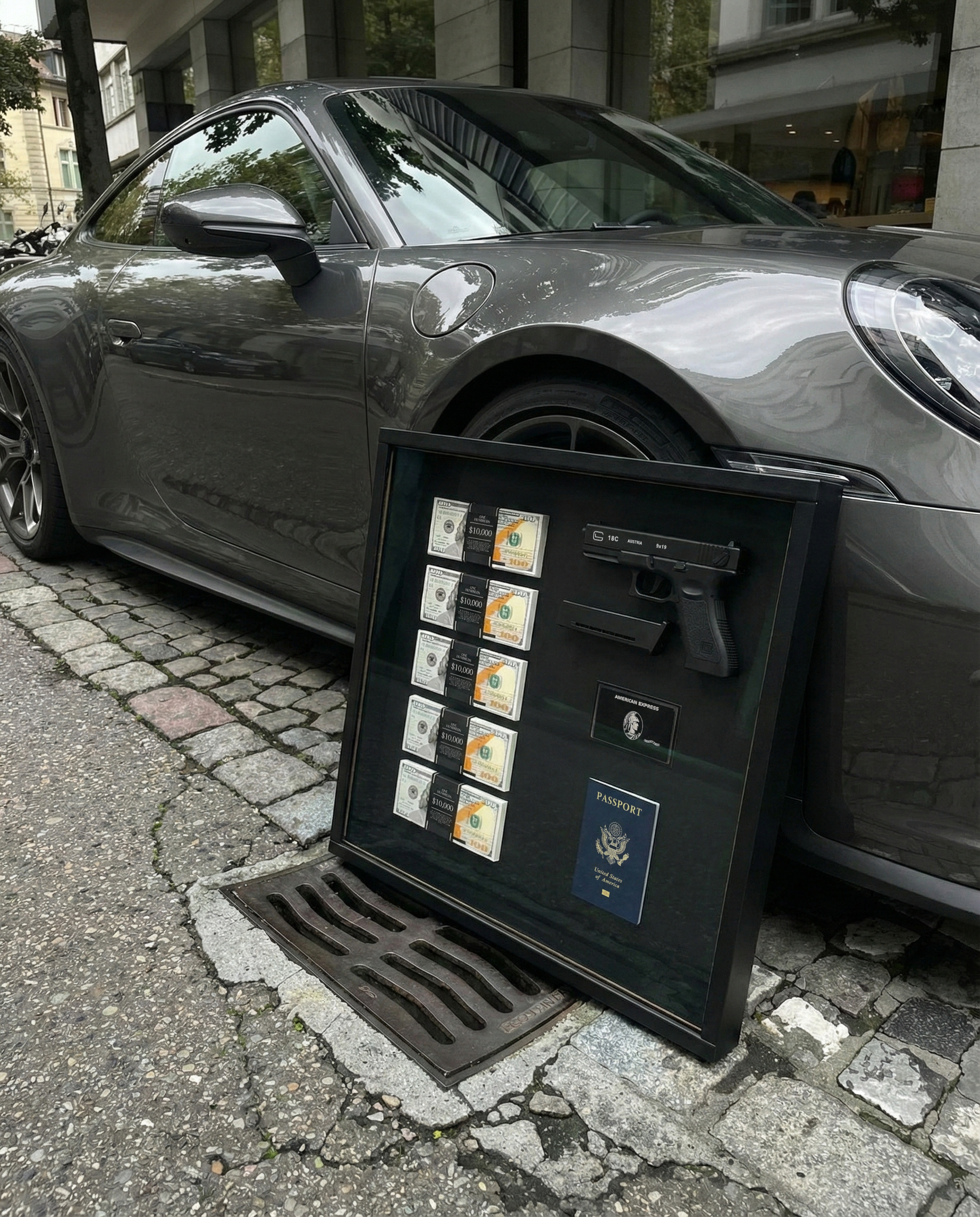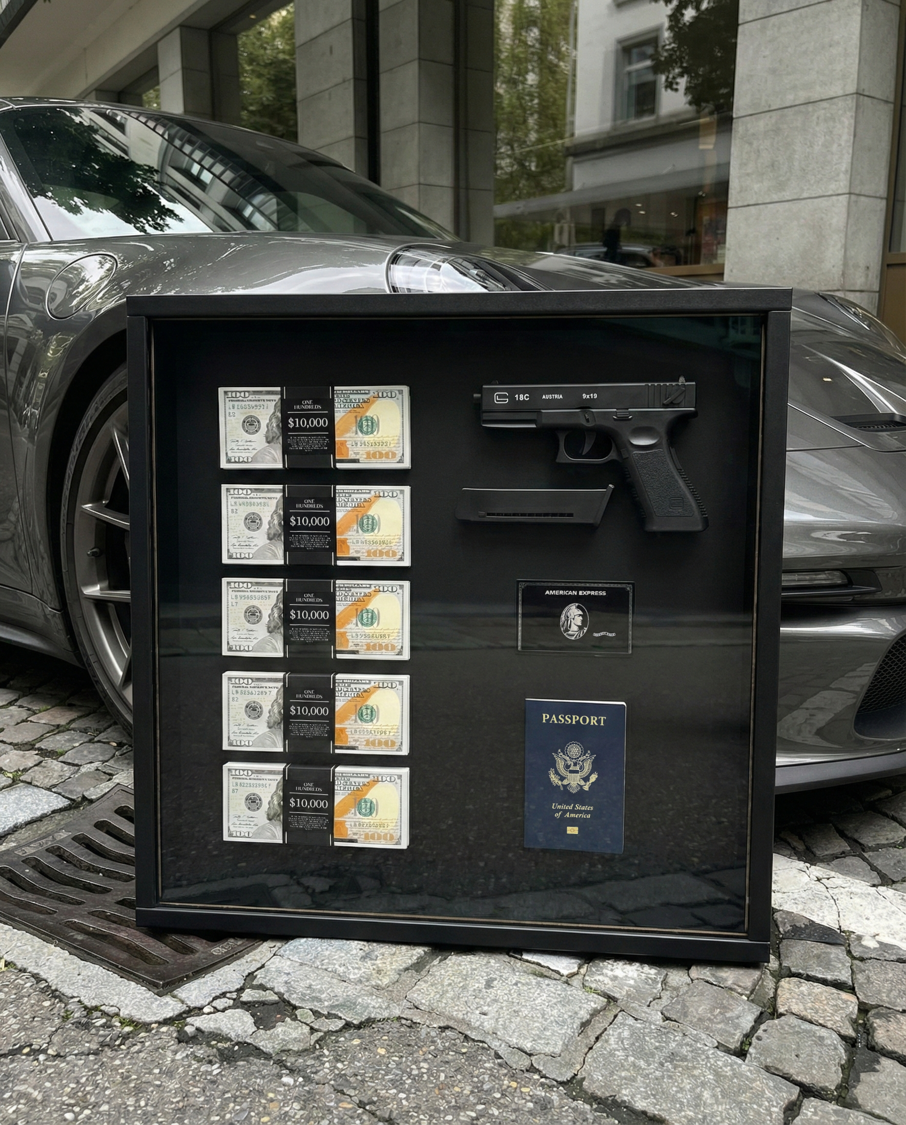 A bold framed display featuring cash stacks, black card, passport, and sidearm.